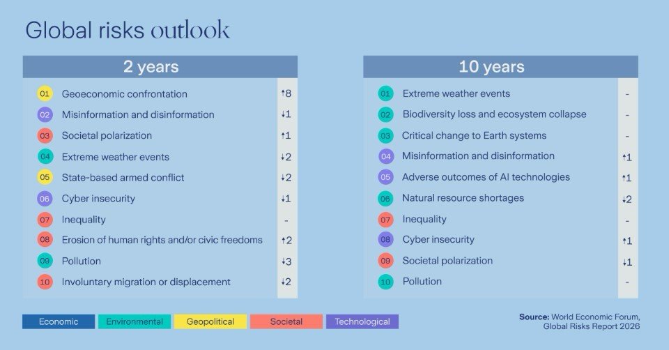 Mientras que la confrontación geoeconómica, los conflictos armados entre estados, los eventos climáticos extremos, la polarización social y la información falsa e incorrecta fueron identificados por los encuestados como los cinco principales riesgos inmediatos en 2026.