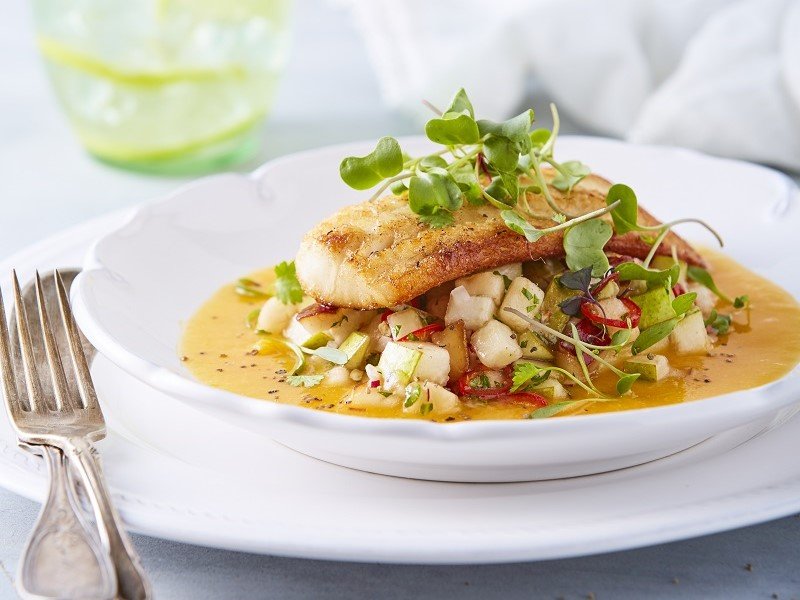 Filetes de pescado con pera y salsa de mango