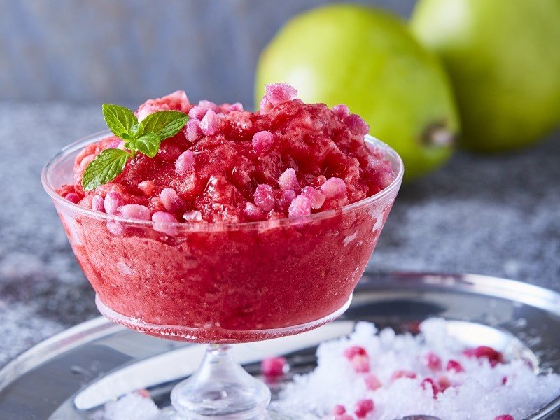Para servir, sirva cada filete sobre una cama de peras y un espejo de salsa de mango y decore con brotes.